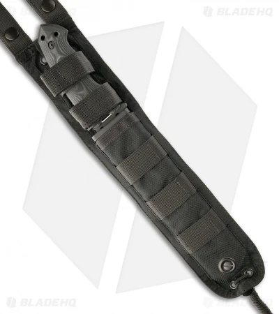 The EX-F01 knife is tough, with a 1/4″ thick A2 tool steel blade this tactical fixed blade isn’t the type to let you down. The 7″ KG Gun-Kote finished drop point blade is full tang with an extended breaker at the base. The shape and contour of the handle offers extreme comfort and grip with the index groove below and spine notches up top. The black G-10 handle scales feature a stylish “G-Mascus” pattern. Securely tucked on the front side of the handle is a Torx wrench so you can remove the scales, revealing a little storage inside. The EX-F01 includes a black Milspec ballistic nylon sheath with a MOLLE compatible back.