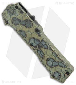 The 6061 T6 aluminum handle is anodized olive green. The drop point style 154-CM stone-wash finished blade (plain) is razor sharp. The blade comes out with a refined smoothness and locks securely into place via the button lock mechanism. There is also a front mounted safety to lock the blade open even more securely. For easy carry there is also reversible pocket clip.