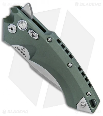 This X-5 flipper model is outfitted with a 3.5″ spear point blade in a stonewashed finish and a green aluminum handle.