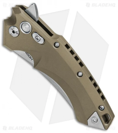 This X-5 flipper model is outfitted with a 3.5″ wharncliffe blade in a stonewashed finish and a flat dark earth aluminum handle.